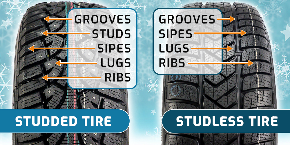 Tiny metal studs embedded in the tread bite into hard ice like claws. They offer unmatched grip on frozen roads but can be noisy, damage pavement, and may be restricted or banned in some areas.